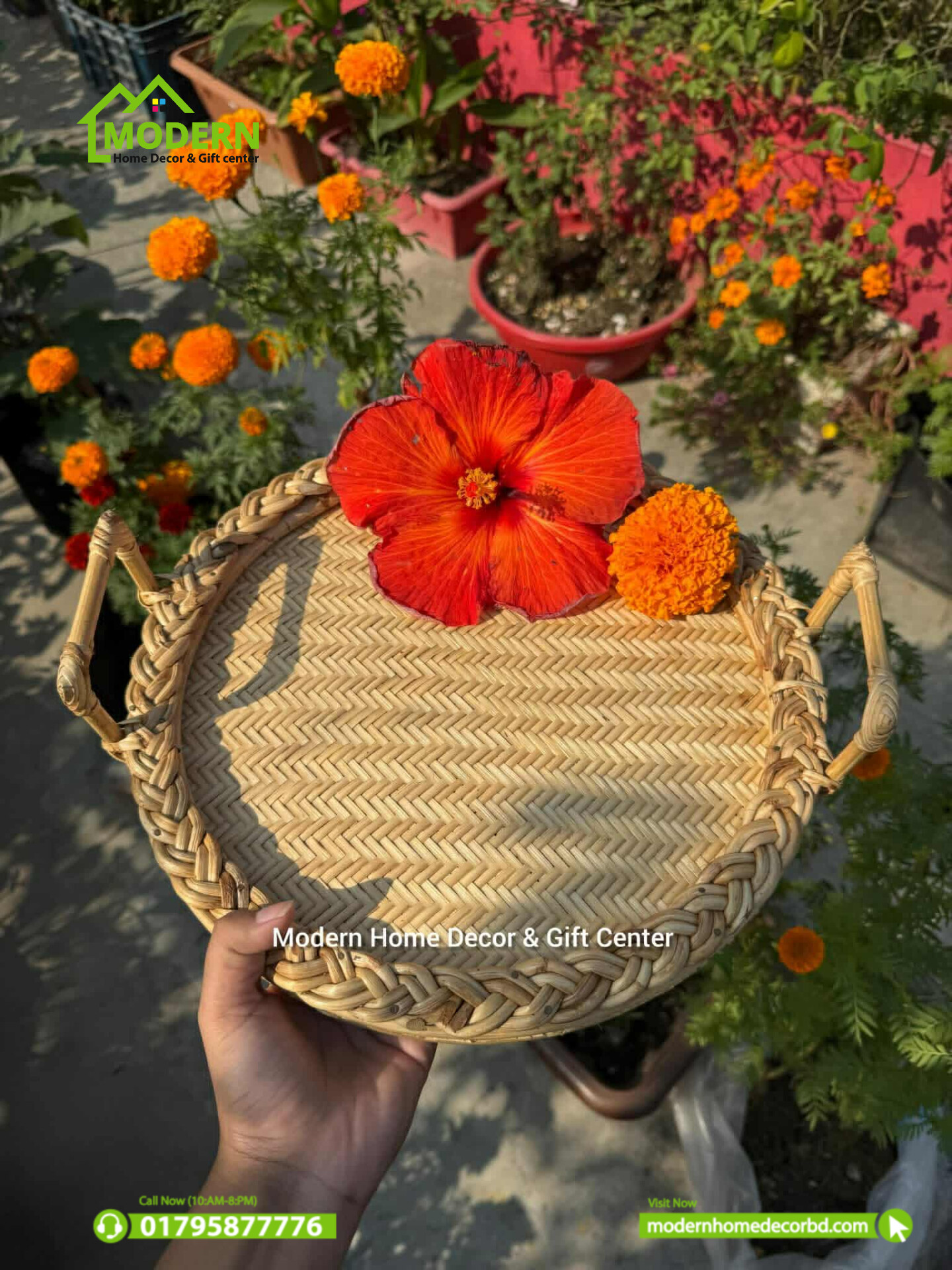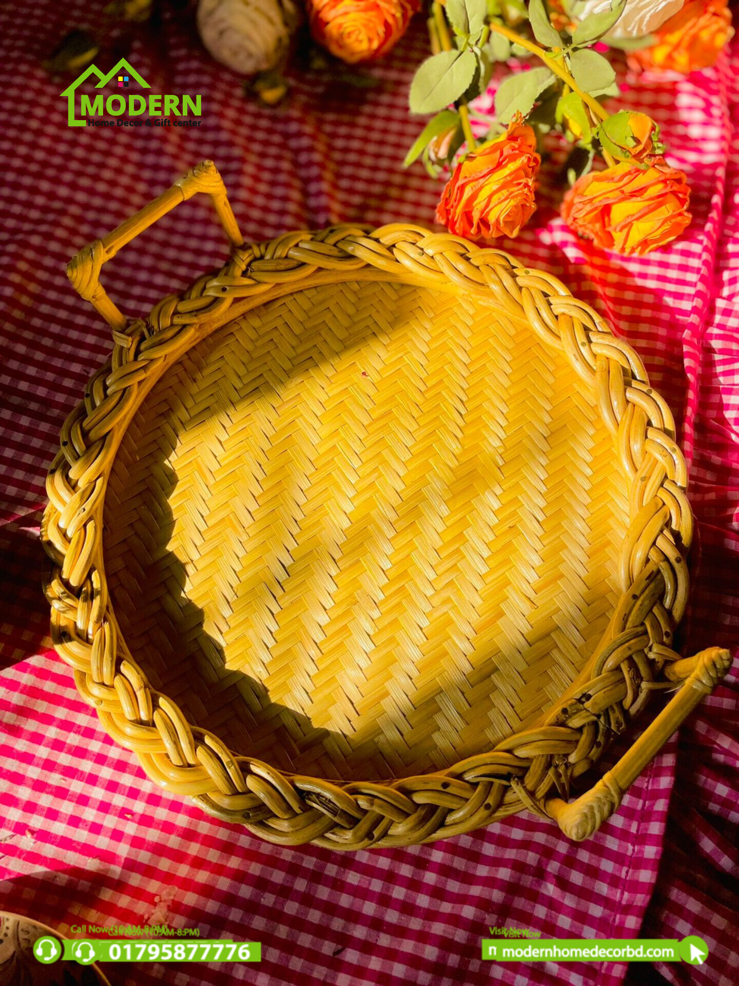 মজবুত হ্যান্ডেল: দুই পাশে মজবুত বেতের হ্যান্ডেল দেওয়া হয়েছে, যার ফলে খাবার বা পানীয় পরিবেশন করা সহজ এবং নিরাপদ।সা